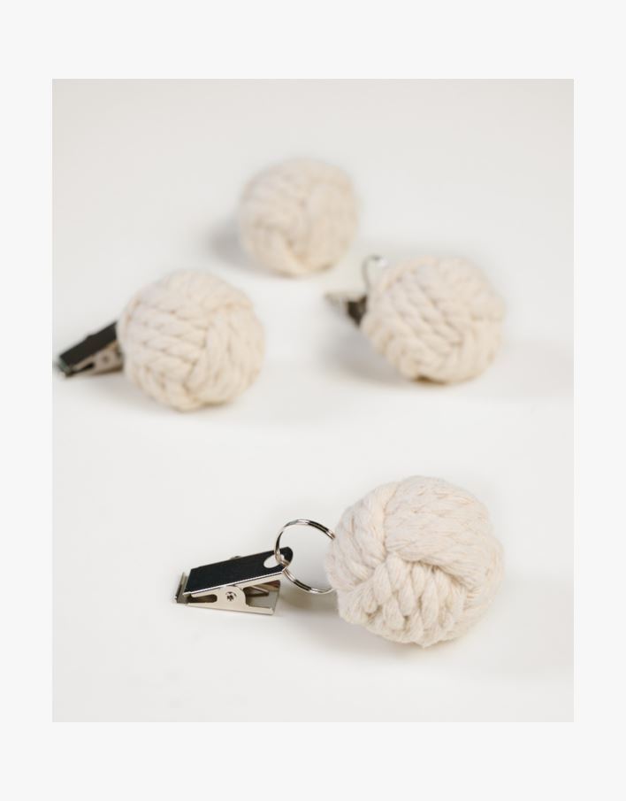 Dekoratiivsed valgendatud kanepinöörist laudlinaraskused. Praktiline ja kena valik õuelaua lina jaoks, et ka tuulise ilmaga lina kenasti laual püsiks. Komplektis 4 raskust näpitsatega.