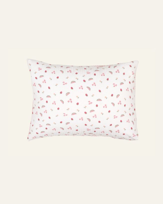 Armsa mustriga krepp-puuvillane padjapüür Fruit Story lisab magamistuppa värskust ja romantilist meeleolu. Õhuline tekstuur ja kerge kortsuline pind annavad kangale ilme, mis sobib ideaalselt hubase ja rahuliku atmosfääri loomiseks.
